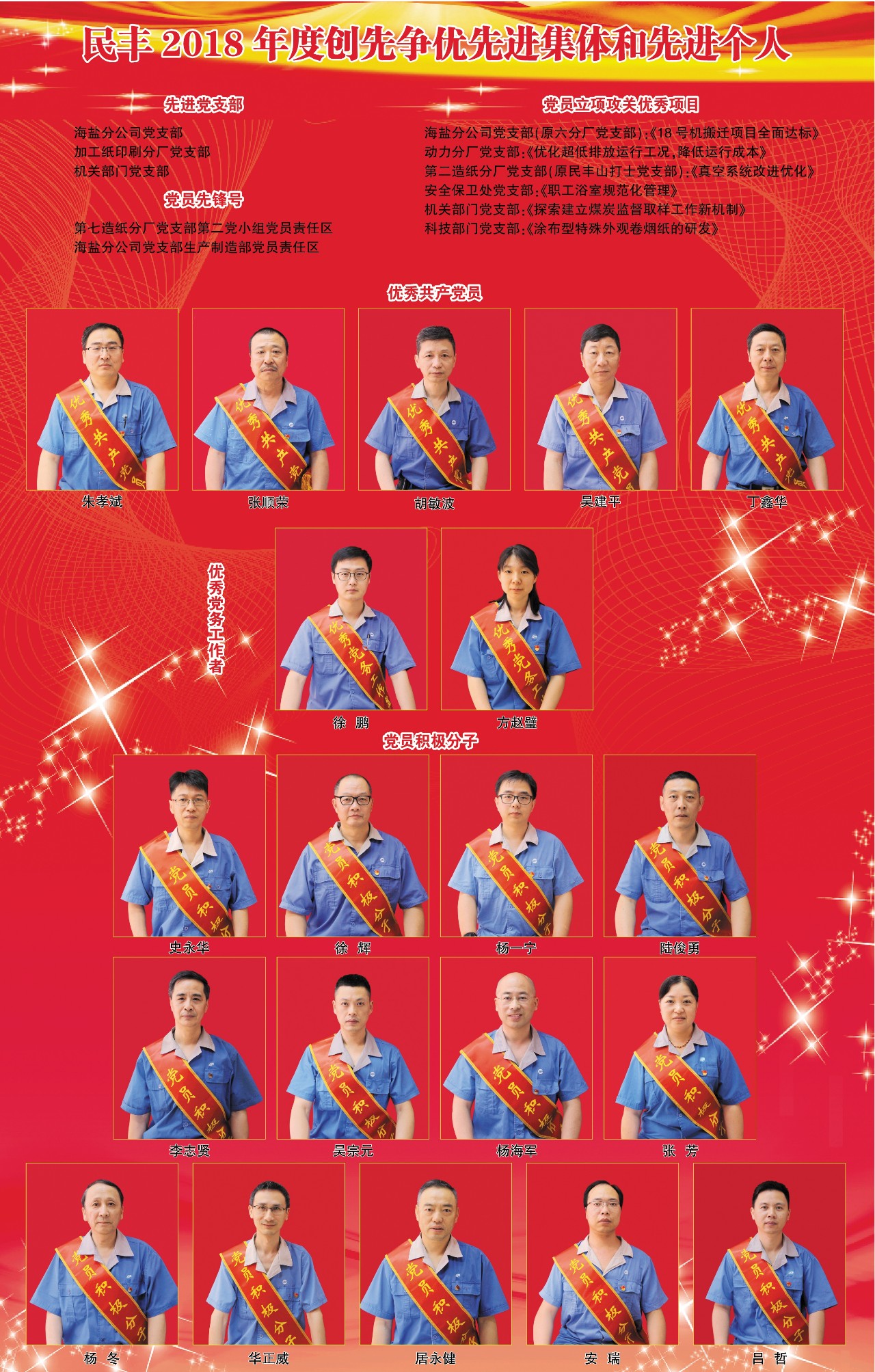 會上,民豐特紙黨委副書記陶毅銘宣讀了《關于表彰2018年度創(chuàng)先爭優(yōu)先進集體和先進個人的決定》。大會對海鹽分公司、加工紙印刷分廠、機關部門3個先進黨支部,七分廠黨支部第二黨小組黨員責任區(qū)、海鹽分公司黨支部生產制造部黨員責任區(qū)2個黨員先鋒號,海鹽分公司黨支部《18號機搬遷項目全面達標》等6個黨員立項攻關優(yōu)秀項目,朱孝斌等5名優(yōu)秀共產黨員,徐鵬等2名優(yōu)秀黨務工作者,史永華等13名黨員積極分子進行了表彰。受表彰的先進集體、先進個人代表先后作了經驗交流發(fā)言。