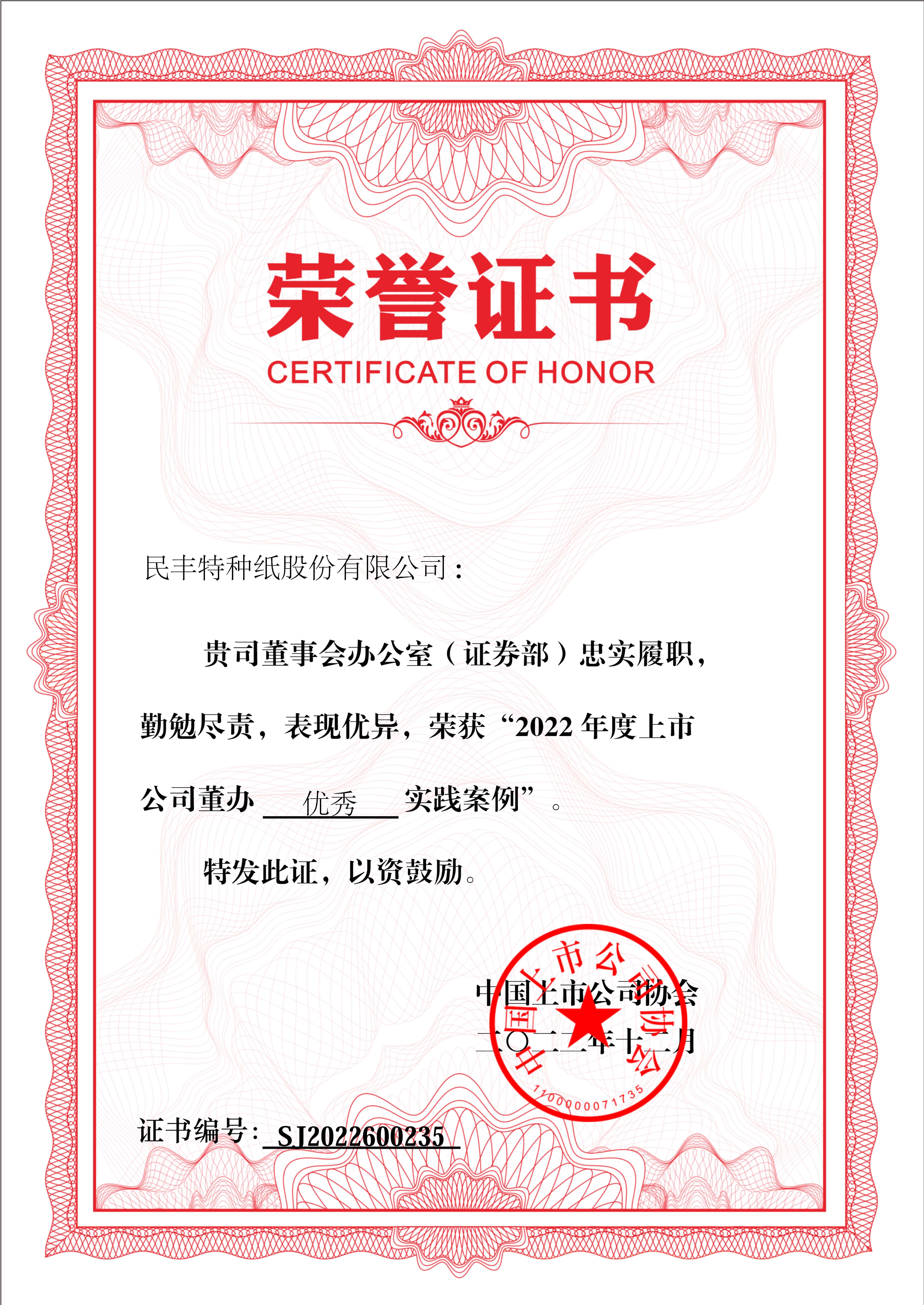 民豐特紙榮獲“2022年度上市公司董辦優(yōu)秀實踐案例”獎